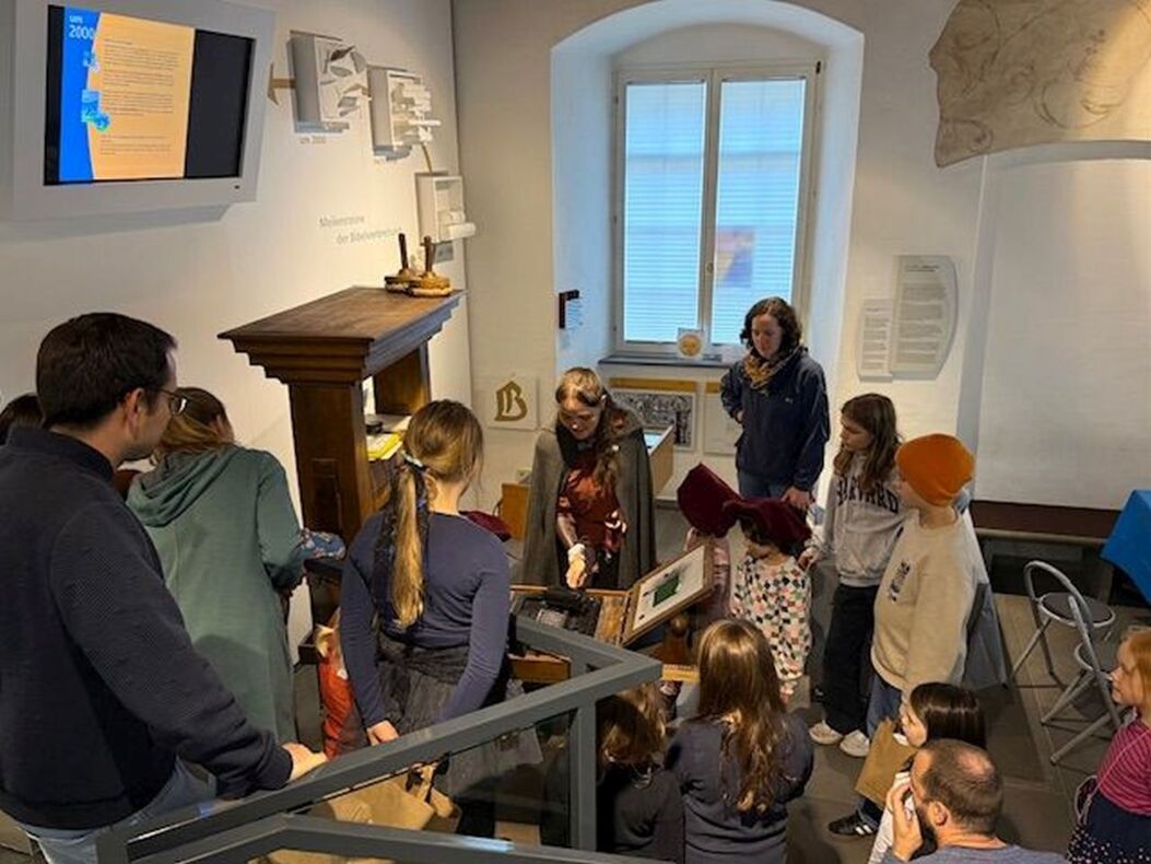 Erst die Erfindung der Druckerpresse beschleunigte die Verbreitung von Schriften. Auch Luthers Gedanken ließen sich nun schneller verbreiten. Die Kinder druckten an der Gutenbergpresse und stempelten mit Buchstaben und Motiven.